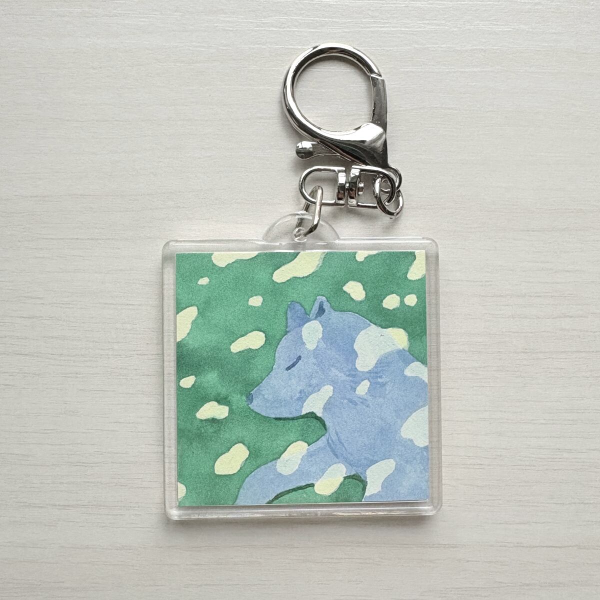 おおかみを描いた小さい水彩画が入ったキーホルダーです。